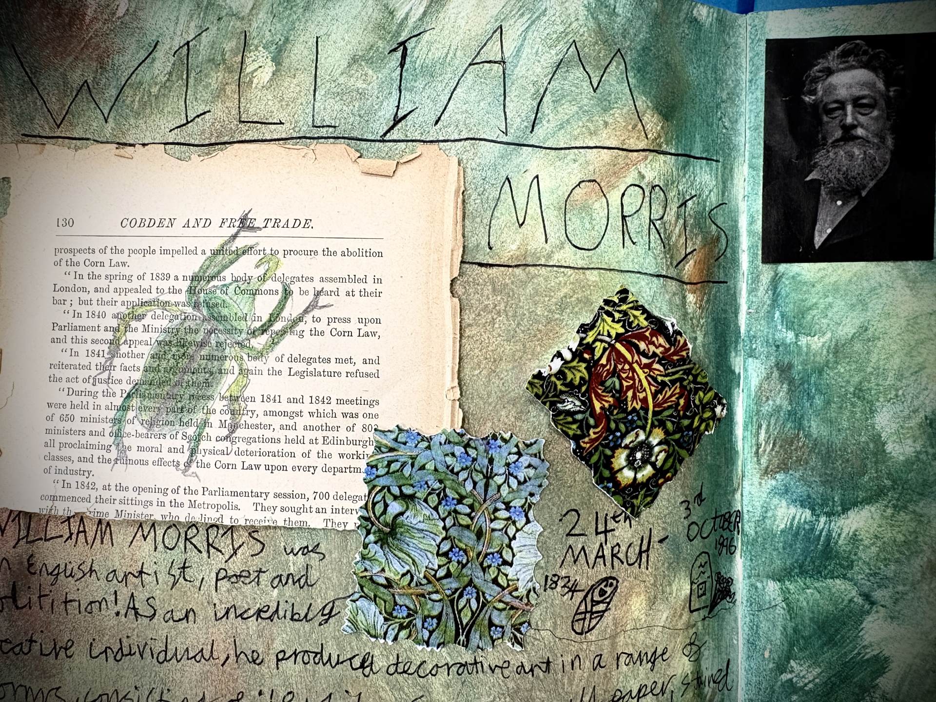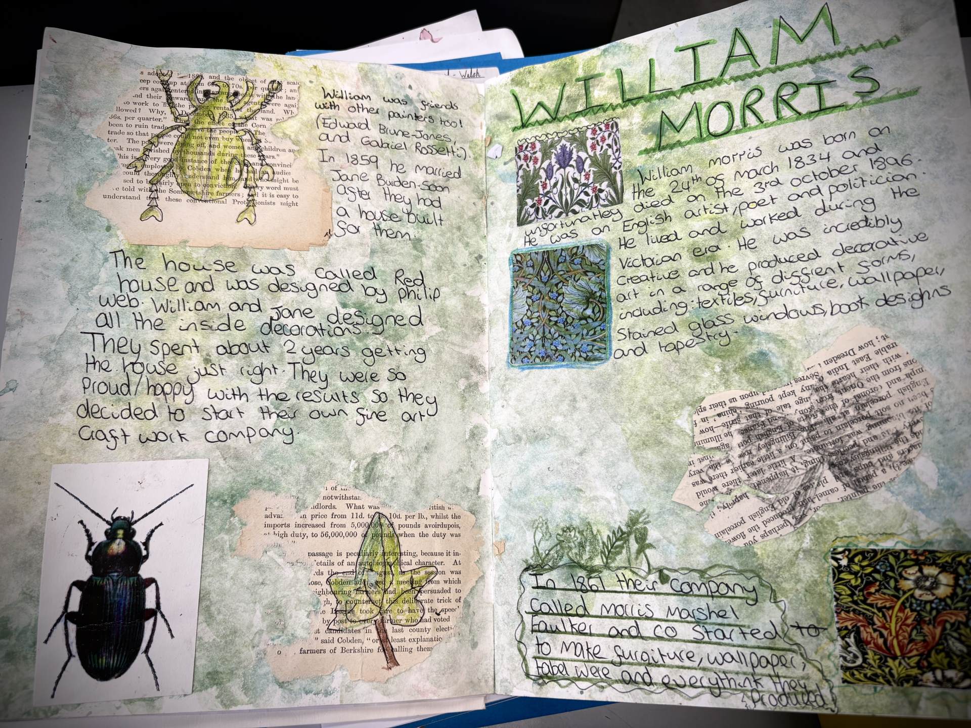 Students are now studying the work of the Victorian artist and designer William Morris. As part of this, they are creating artist link pages in their sketchbooks. Alongside written research about Morris, students have produced interesting painted backgrounds and detailed drawings of insects, flora, and fauna, created on the pages of old, discarded books.