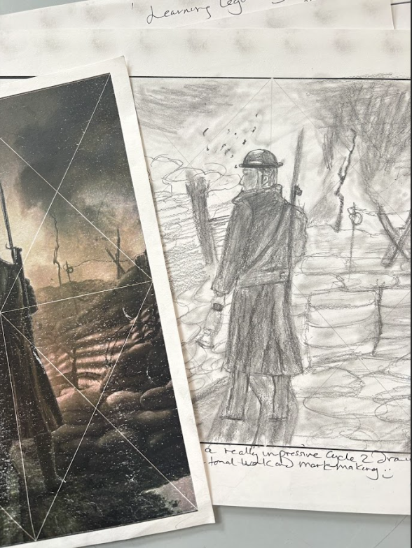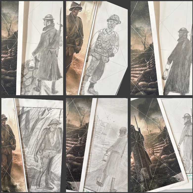 Students were then given a choice of images depicting soldiers in wartime environments to draw from. They paid particular attention to composition, mark-making, and exploring a range of tonal values.