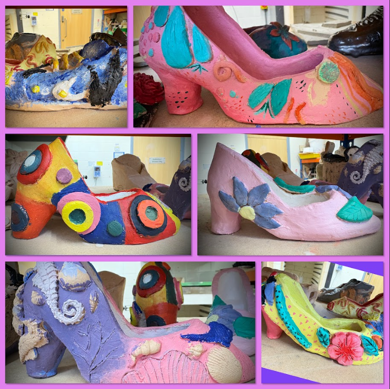 Year 9 Art students have been busy in the art room designing and creating shoes and trainers in clay, inspired by their favourite artists. Some of the artists studied have included: Georgia O'Keeffe, Kandinsky, Vincent Van Gogh and Banksy.