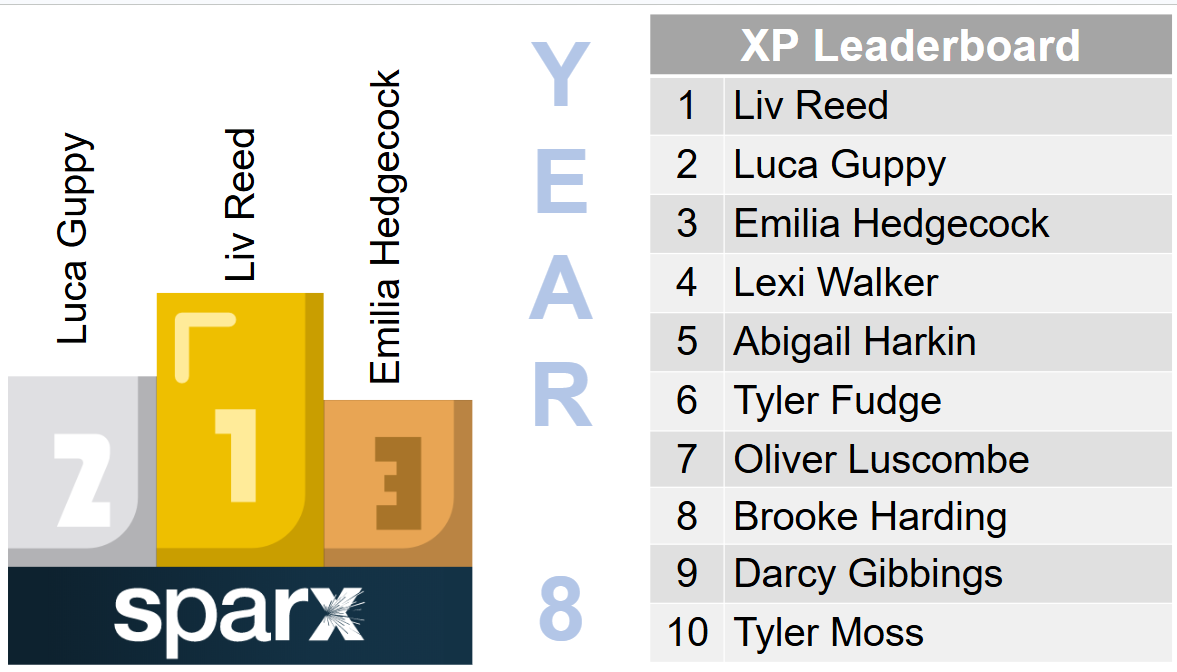 Year 8 - Finley Elliott, Isaac Hodge, Lilly-May Lee, Nouh Haridi, Henry Cooper, Kyle Squires, Annabella Hodge, Henry Nash, Amelia Palla, Jack Parker, Holly-Rae Mason, Achara Edmund, Sienna Blampey-Roberts, Archie Payne-Stanbury, Leo Watson, Abi Allen, Imogen Schneider, Lottie Forrester and Lexi Kenneford