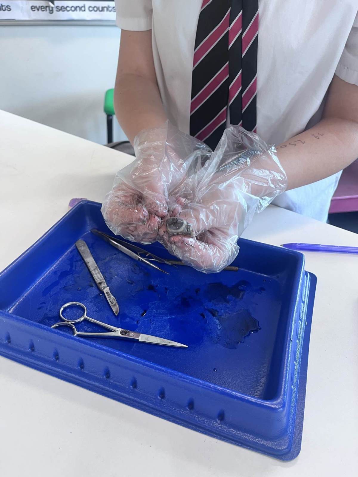 This week Year 8 have been learning about light and how the eye works. To demonstrate this they carried out an eye dissection using pigs eyes. The students identified the optic nerve, iris, pupil, and cornea. They then cut open the eye to find the lens and some students were even able to locate the retina at the back of the eye.