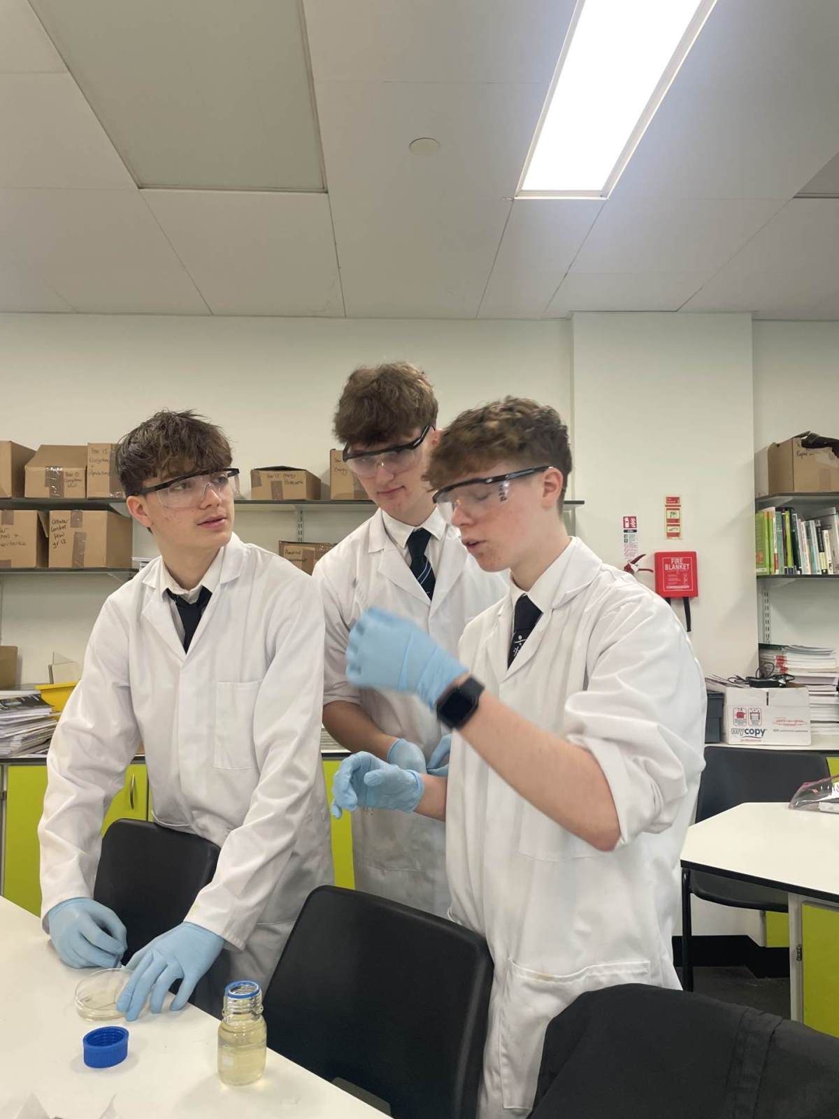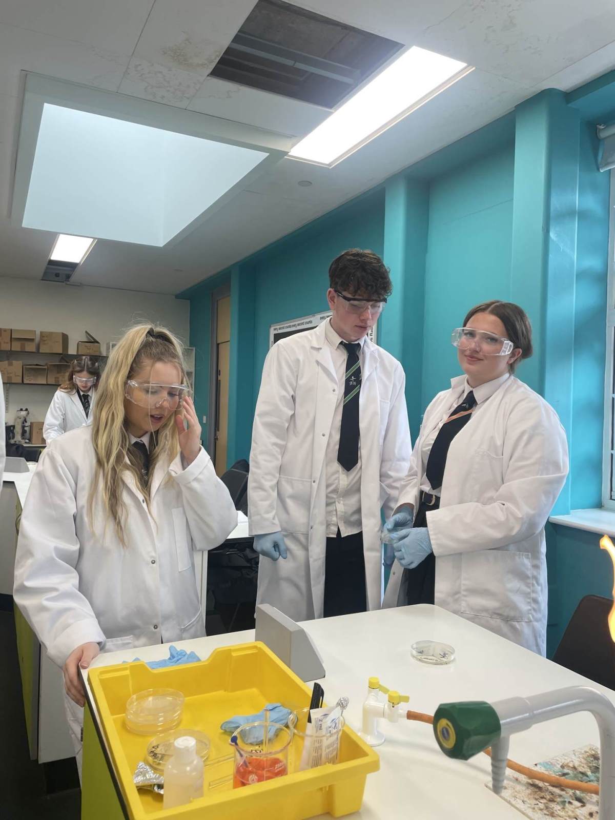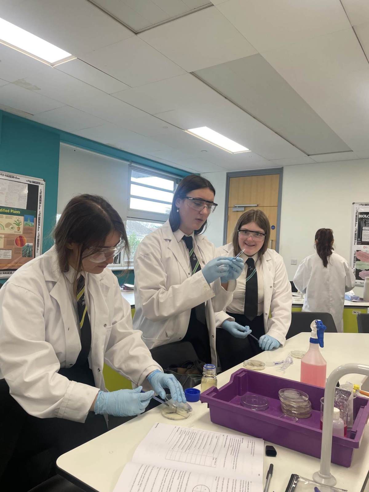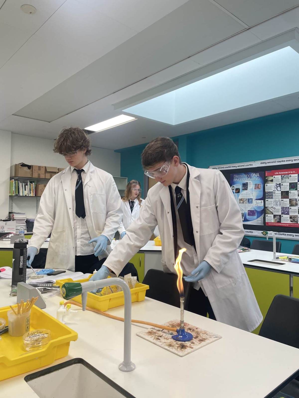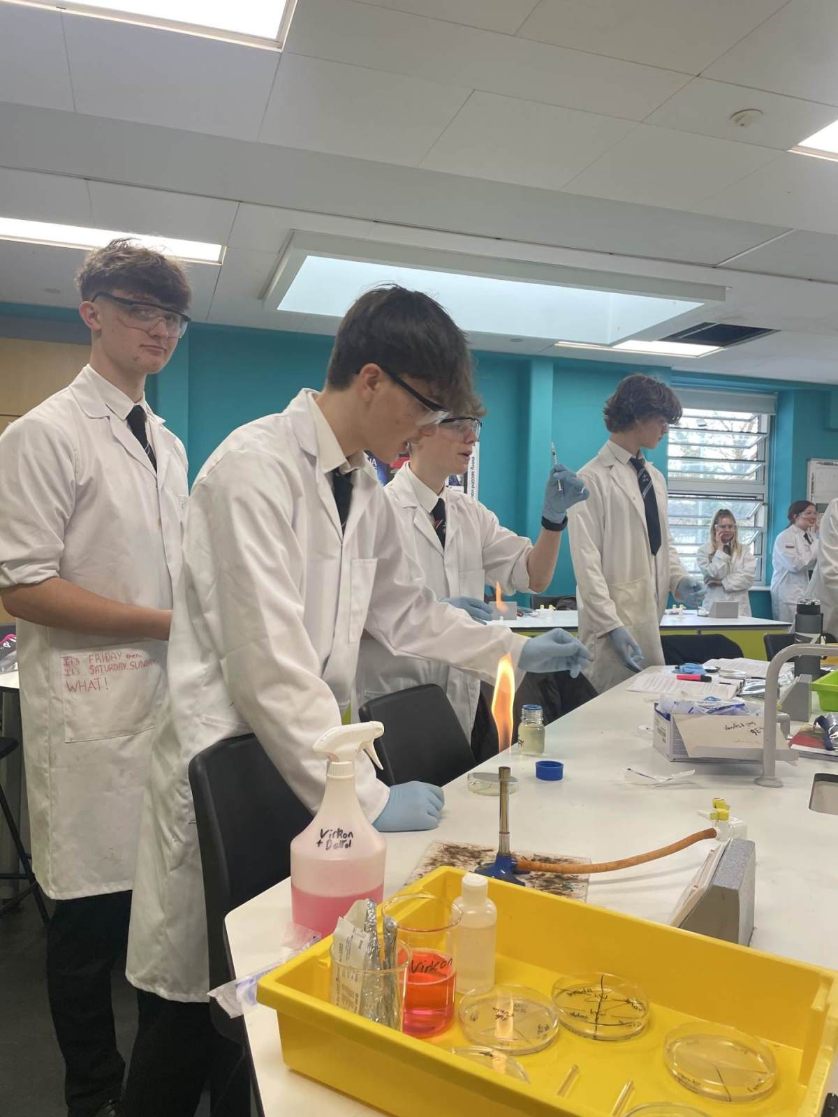 This week the year 12 Biologists have been learning about the specific immune response and about how drugs such as antibiotics can treat bacterial infections. They carried out a practical using microbiological aseptic techniques to grow bacteria on agar plates and investigate which antibiotics are the most effective at killing these bacteria. The students needed to use a lit Bunsen burner in order to create convection currents to prevent any airborne microorganisms from settling on their workbench.