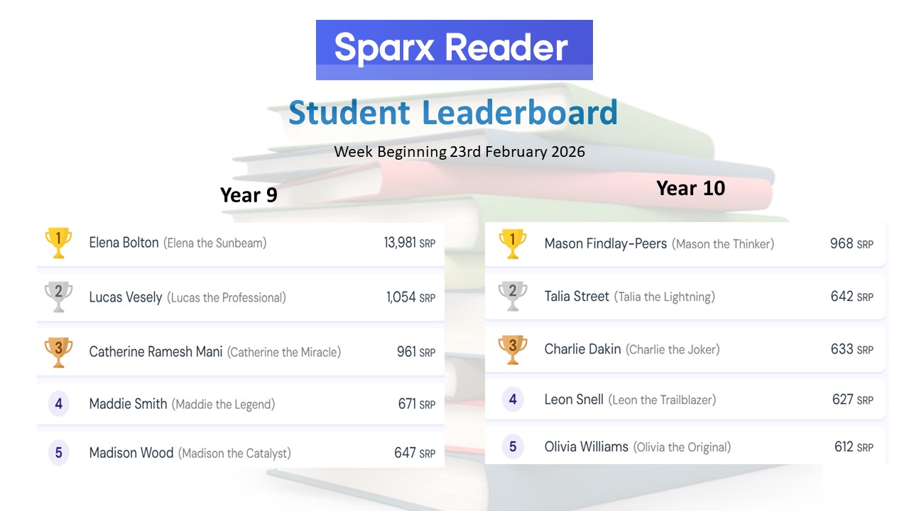 Year 9 - Ocean Brant, James Costello, Corey Davies, Kara Breach, Chloe Taylor, Serenity Ward, Esmie Riggs, Elias Jeffery, Farah Davidson, George Giles, Myah Sellick, Lucas Vesely, Seraphina Rozier, Madeline Woodger, Levi Jones, Maisy Hart, Isaac Mccabe, Lily Langler, Samuel Kuc, Ayden Quarshie, Aaliyah Akpo, Thalia Dunsmore and Bobby O'Regan