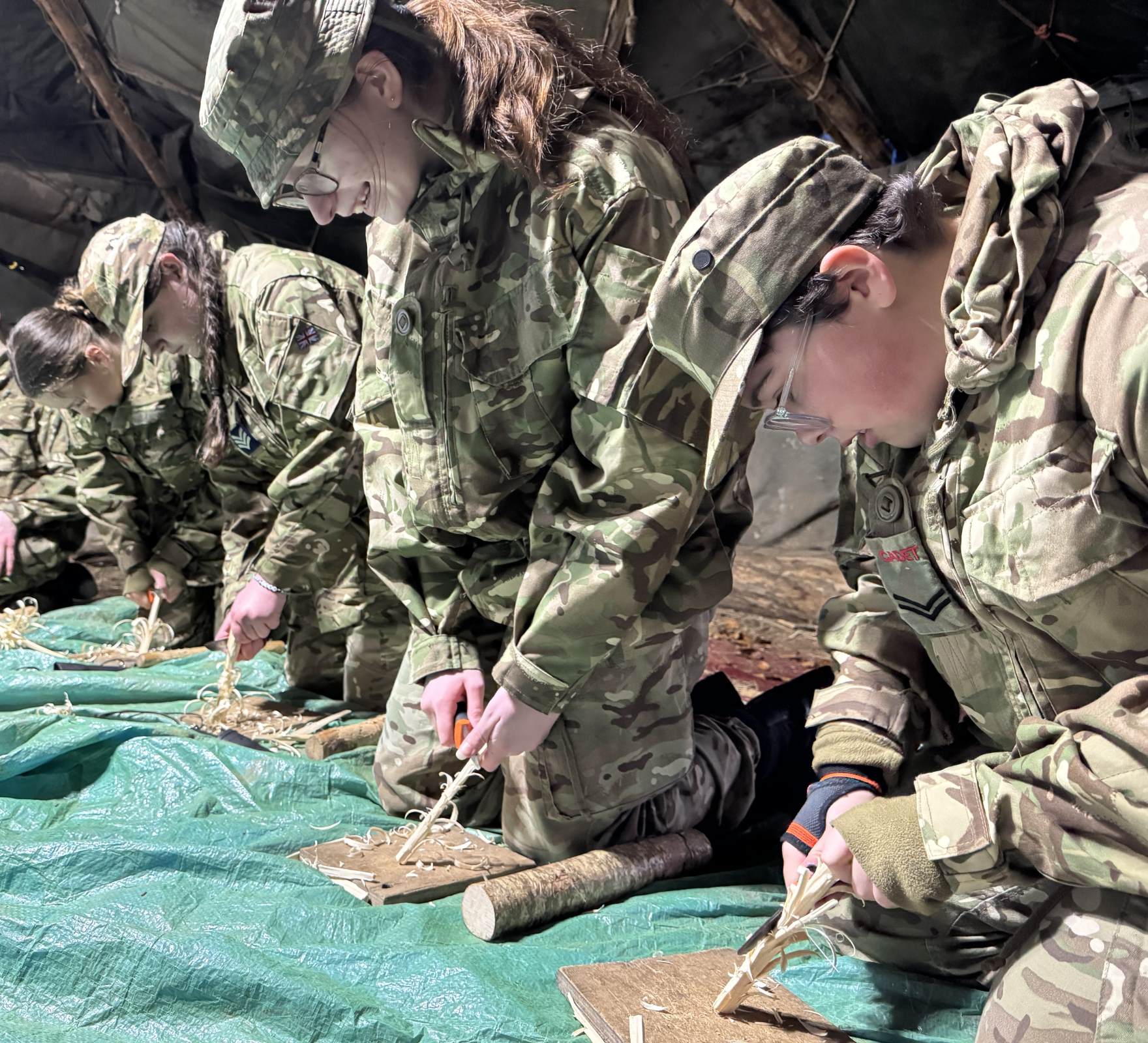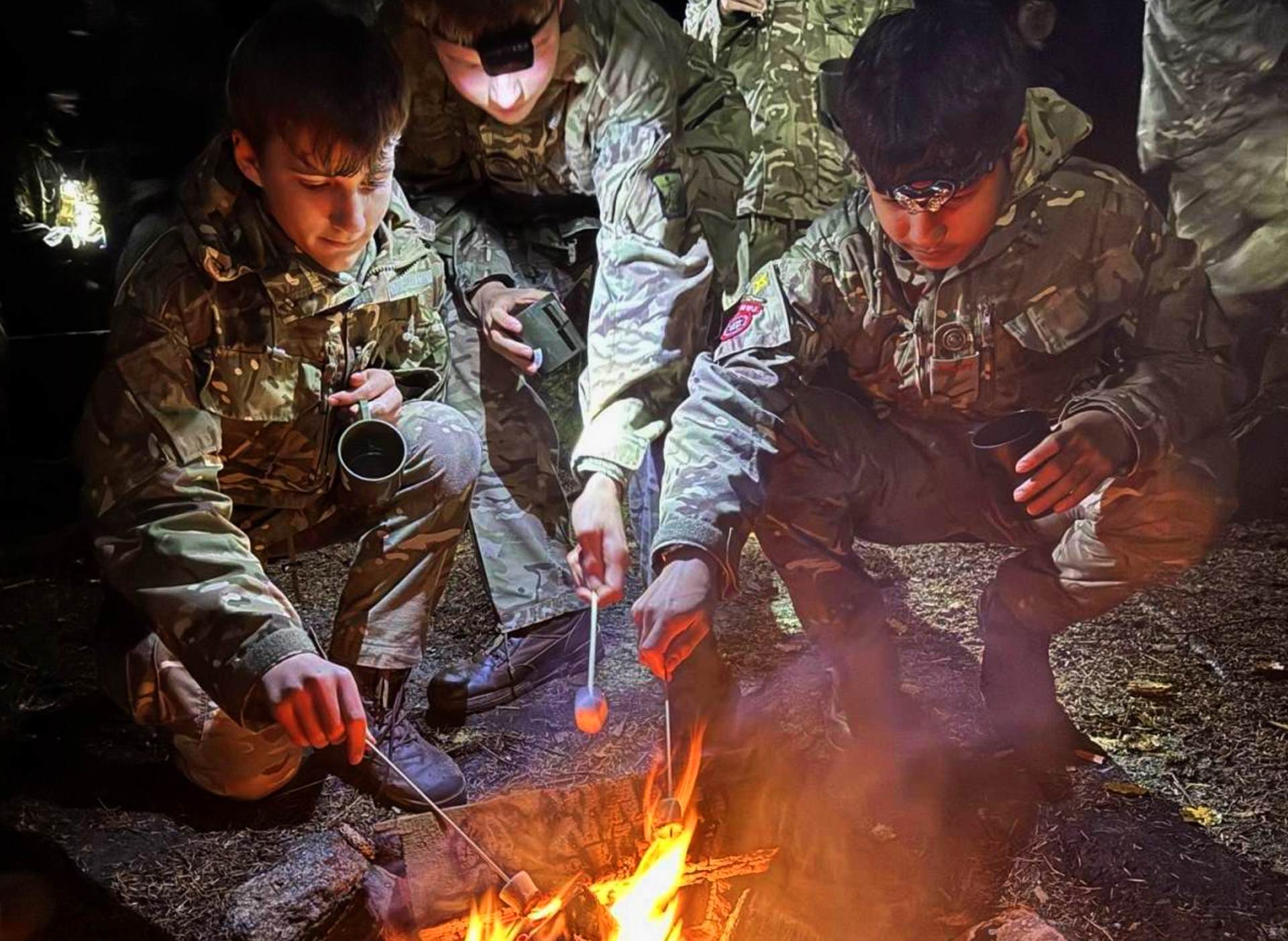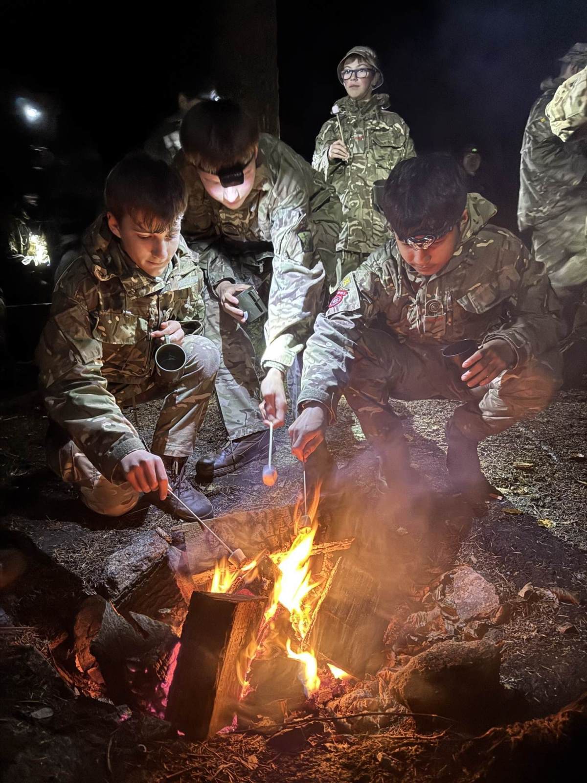 The cadets arrived on Friday evening and, with head torches on, made their way into the wood block where their sleeping shelters were already set up. Once bags were dropped, a well-earned pasta meal was served to fuel the evening ahead.