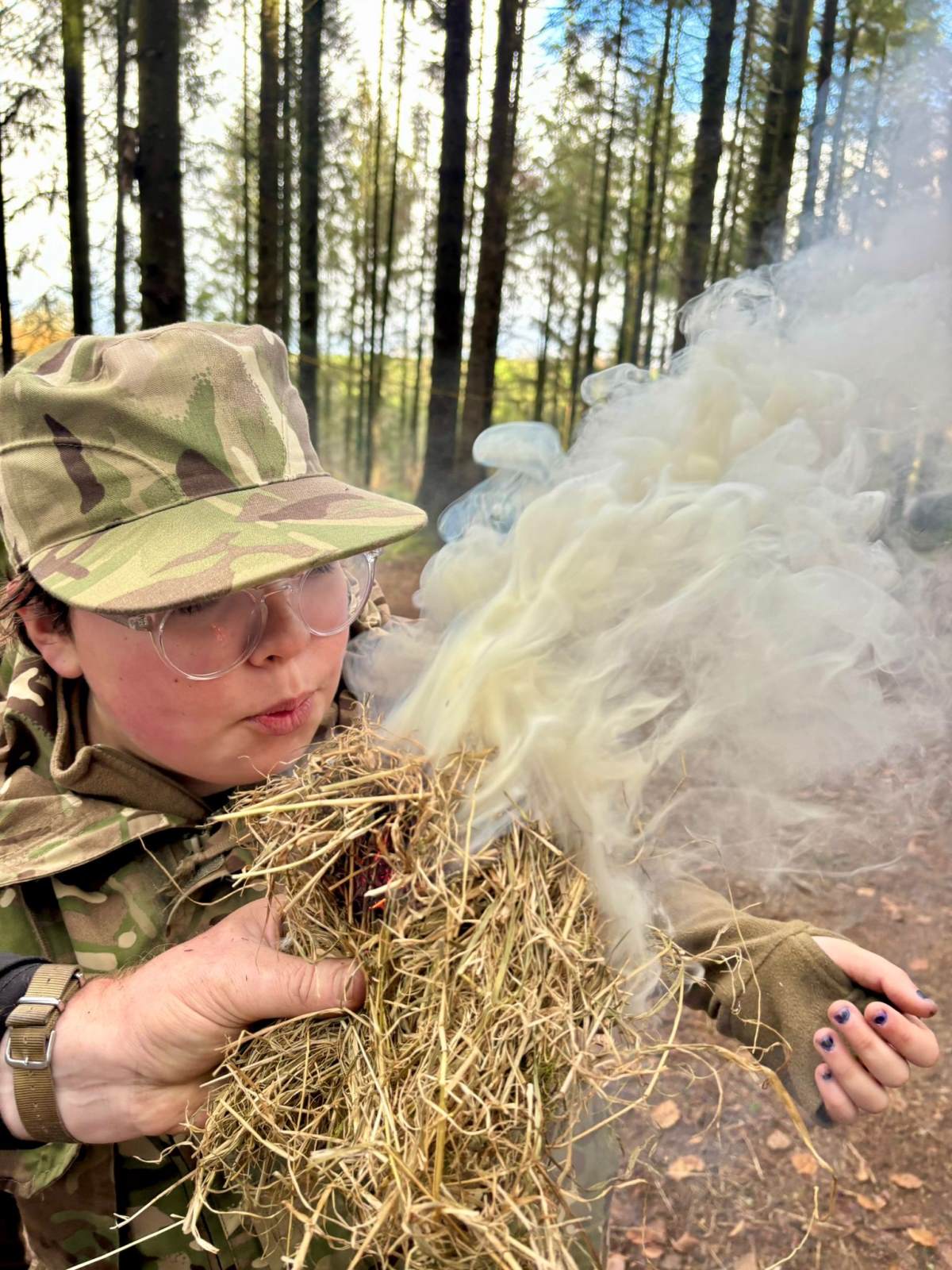 With wet weather rolling in, the team moved straight into lessons on fire-making. Cadets learned how to select the right wood for kindling, how to build and sustain a fire, and even explored which everyday disposable items could be used to heat water or act as survival aids. After a couple of hours of hands-on learning, everyone gathered around a pit fire for hot chocolate and the mandatory marshmallows—always a highlight.