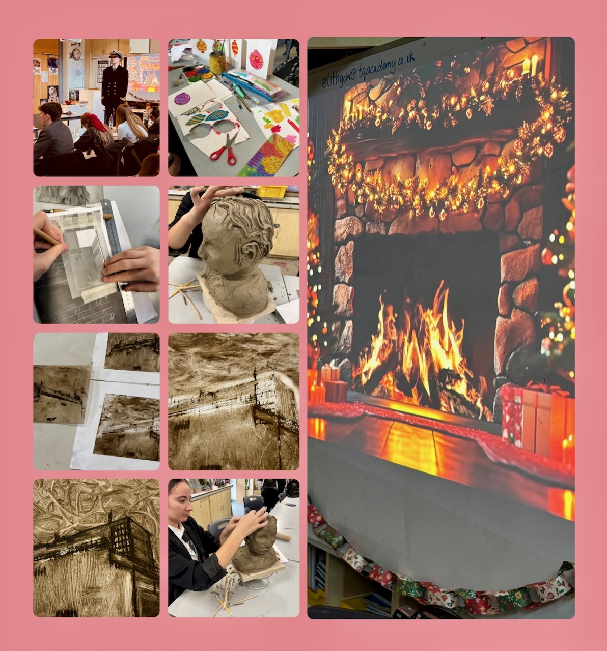 This week in the art department has been full of creativity and festive warmth. Our Year 8 students have been busy with dynamic figure-drawing sessions, sketching soldiers and exploring posture, balance and gesture. Nearby, Year 7 filled the classroom with seasonal cheer as they designed Christmas cards beside a cosy, crackling fire — perfect inspiration for winter-themed artwork. Meanwhile, Year 12 artists took their practice to new heights, experimenting with etching techniques and sculpting expressive clay busts that showcase both skill and imagination. A wonderfully productive week all round.