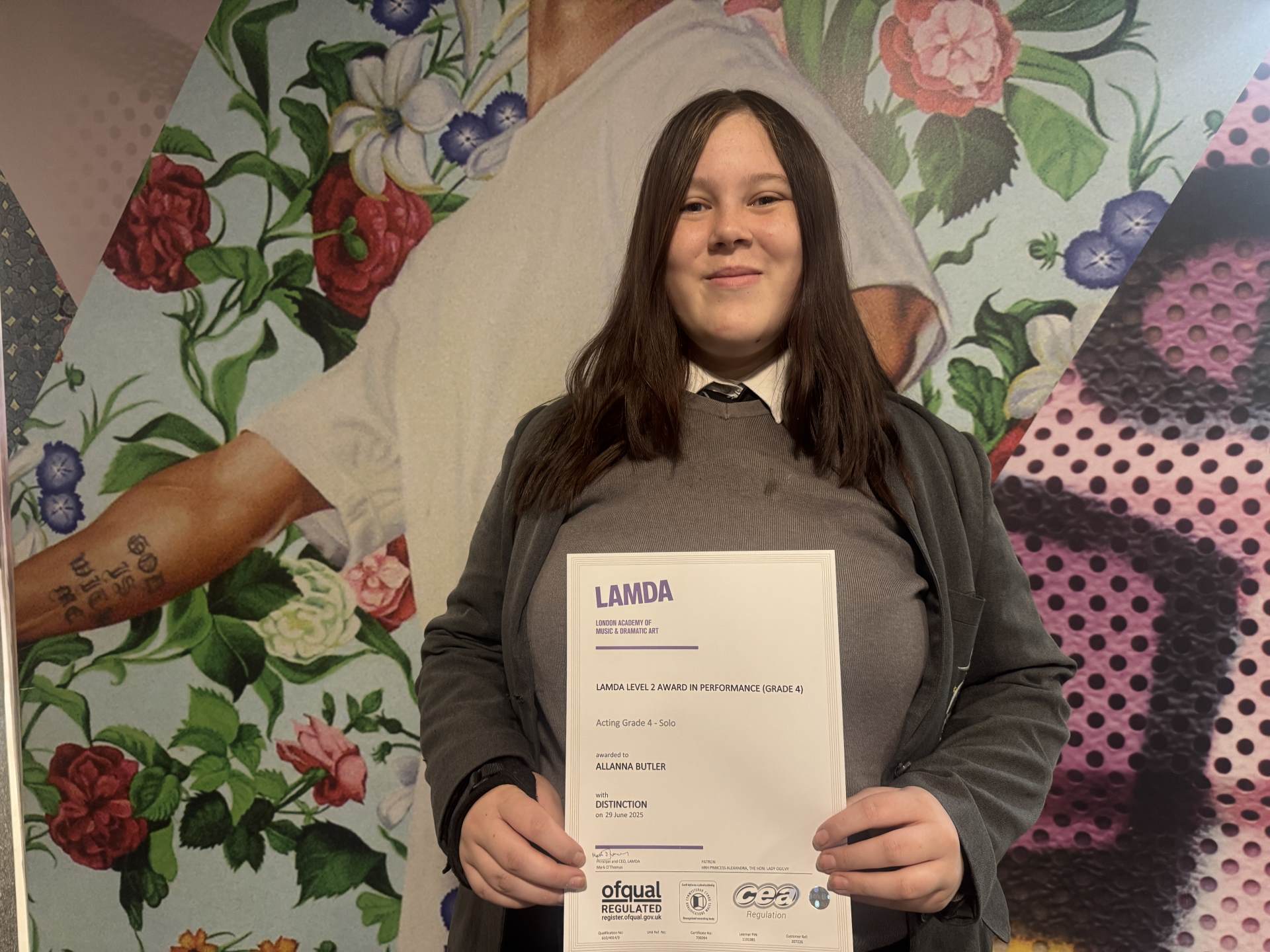 This is a truly monumental accomplishment. LAMDA exams challenge pupils to develop exceptional vocal clarity, confidence, and interpretive skill. Earning a Distinction signifies a level of mastery that goes above and beyond, demonstrating Allanna's commitment and passion for the dramatic arts.