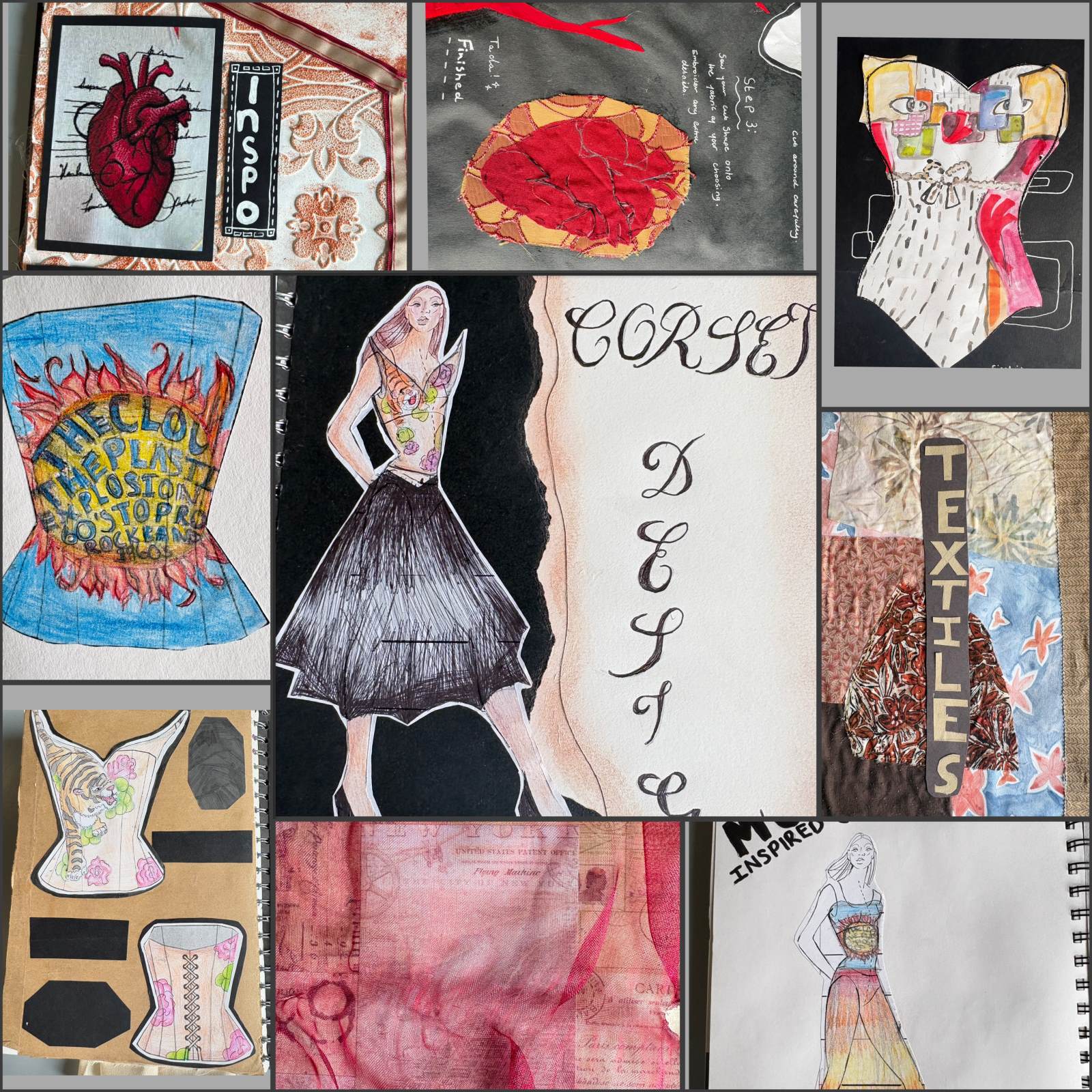 Mrs Lynch’s Year 10 Art students are currently working on their Textiles Unit as part of their Identity Project. Students are developing an exciting range of traditional textile skills, including pattern cutting, pinning and tacking, machine stitching, and garment construction. Students are given creative freedom to research and select their own artists and designers to inspire the creation of their Art Corsets and Art Waistcoats. Alongside this, students are enthusiastically exploring additional textile techniques such as fabric painting, stamping, slashing, appliqué, and embroidery to further enhance and personalise their designs.