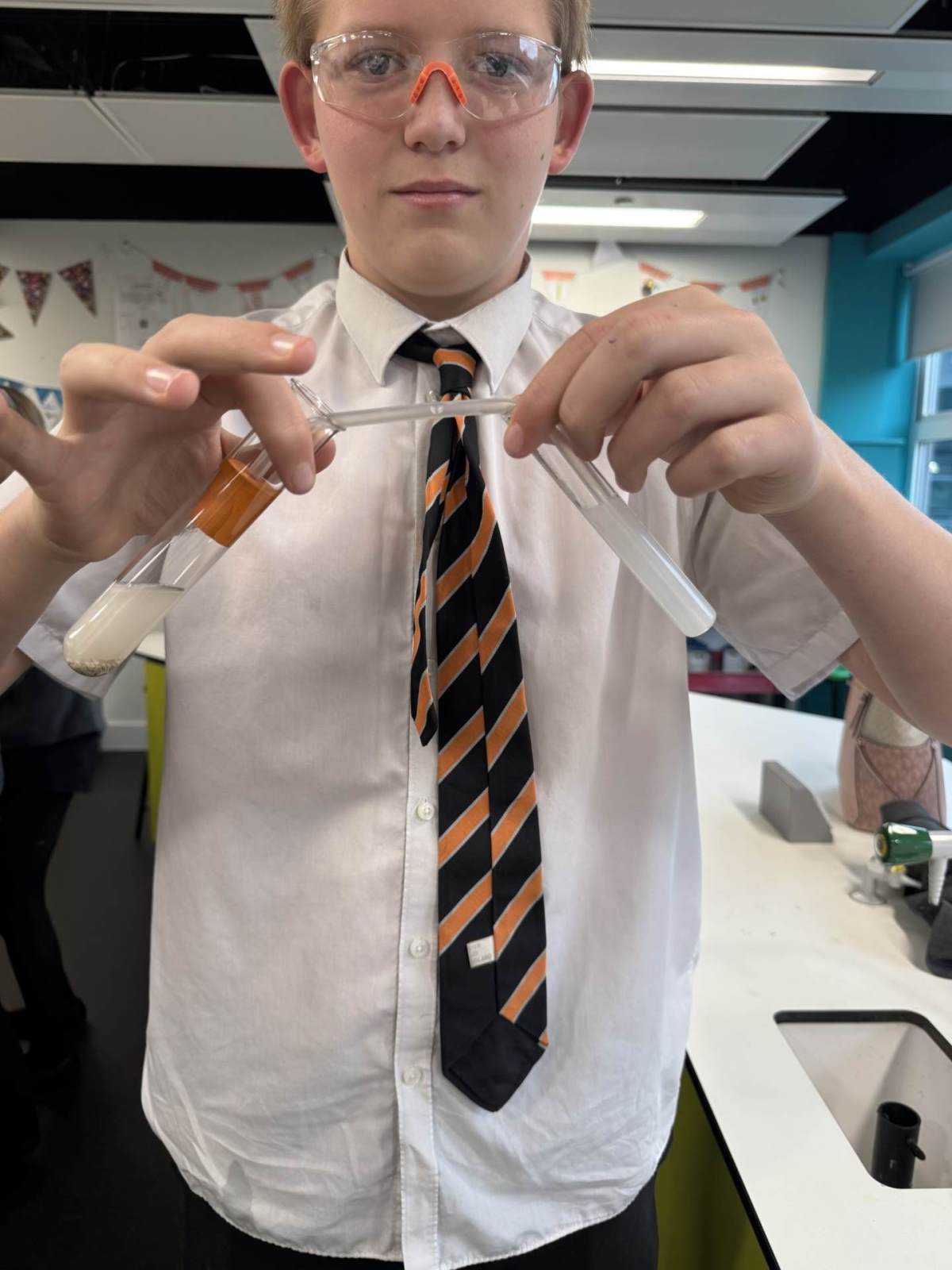 Students in Year 10 used lime water to show a positive test for Carbon Dioxide when mixing metal carbonates with acids. The carbon dioxide gas was captured in the lime water which made it go from colourless to cloudy.