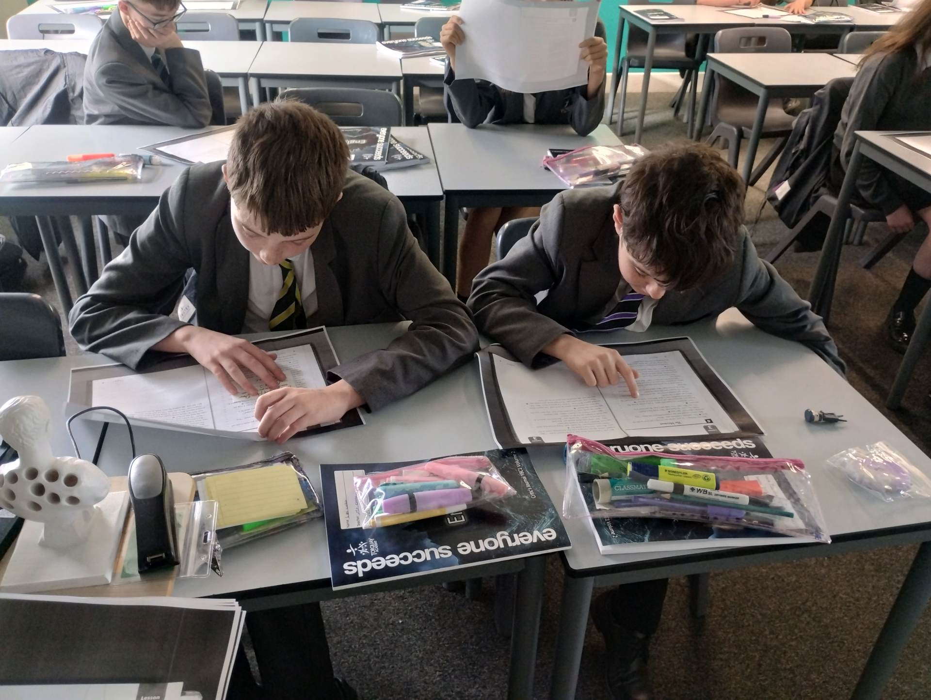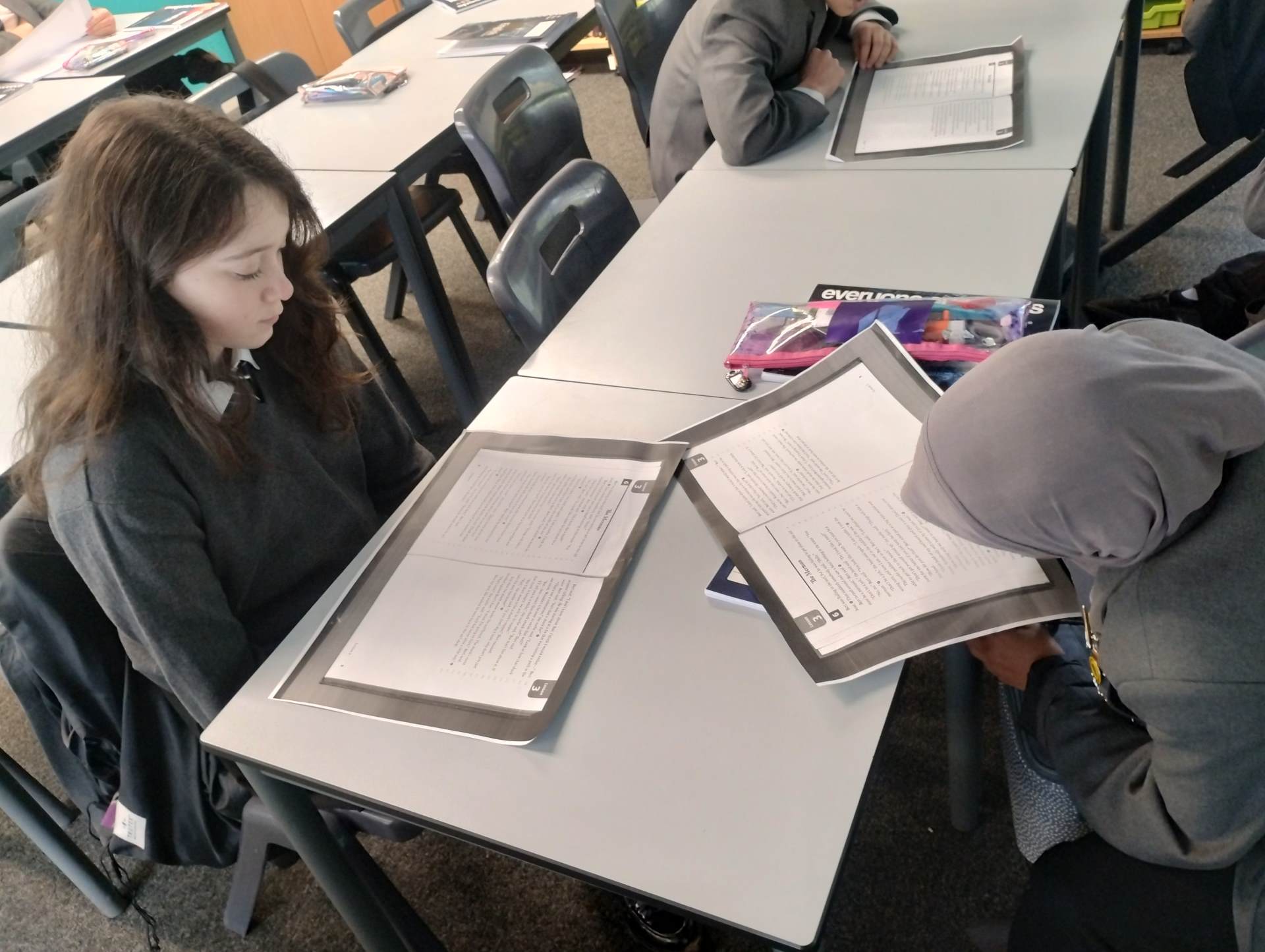 Our current curriculum focus is Gothic Literature, with recent weeks exploring the way in which emotional repression and societally enforced expectations can drive a person to insanity. This week, fittingly for Mr Crow's corvid room, also saw the appearance of Edgar Allen Poe's The Raven. There was much quothing and choral repetition of 'Nevermore.' 8Q6 also devote a lot of time to reading practice, and they have been making excellent progress with their new reading material. Once a shared reading has been completed accurately they move to pairs in order to attempt the passage individually. Their partner follows their reading and listens for mistakes, as seen below.