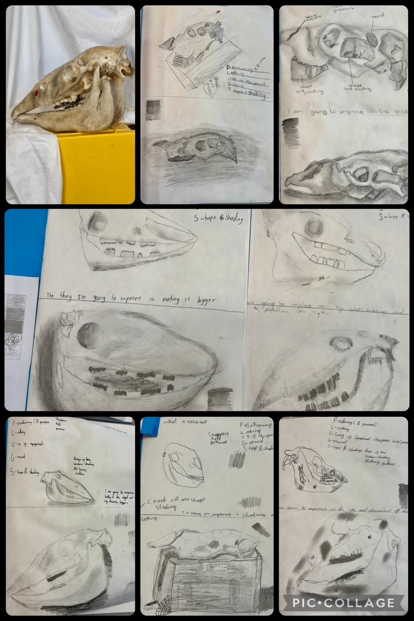 Mrs Lithgow's Year 7 art students have been working on pencil observational drawings of animal skulls, and the progress has been fantastic to see. After starting with some initial sketches, they focused on improving their pencil control, experimenting with texture and tone to create depth and form. The final drawings show a real leap in confidence and skill – from tentative outlines to detailed, thorough studies that capture the structure and character of the skulls.