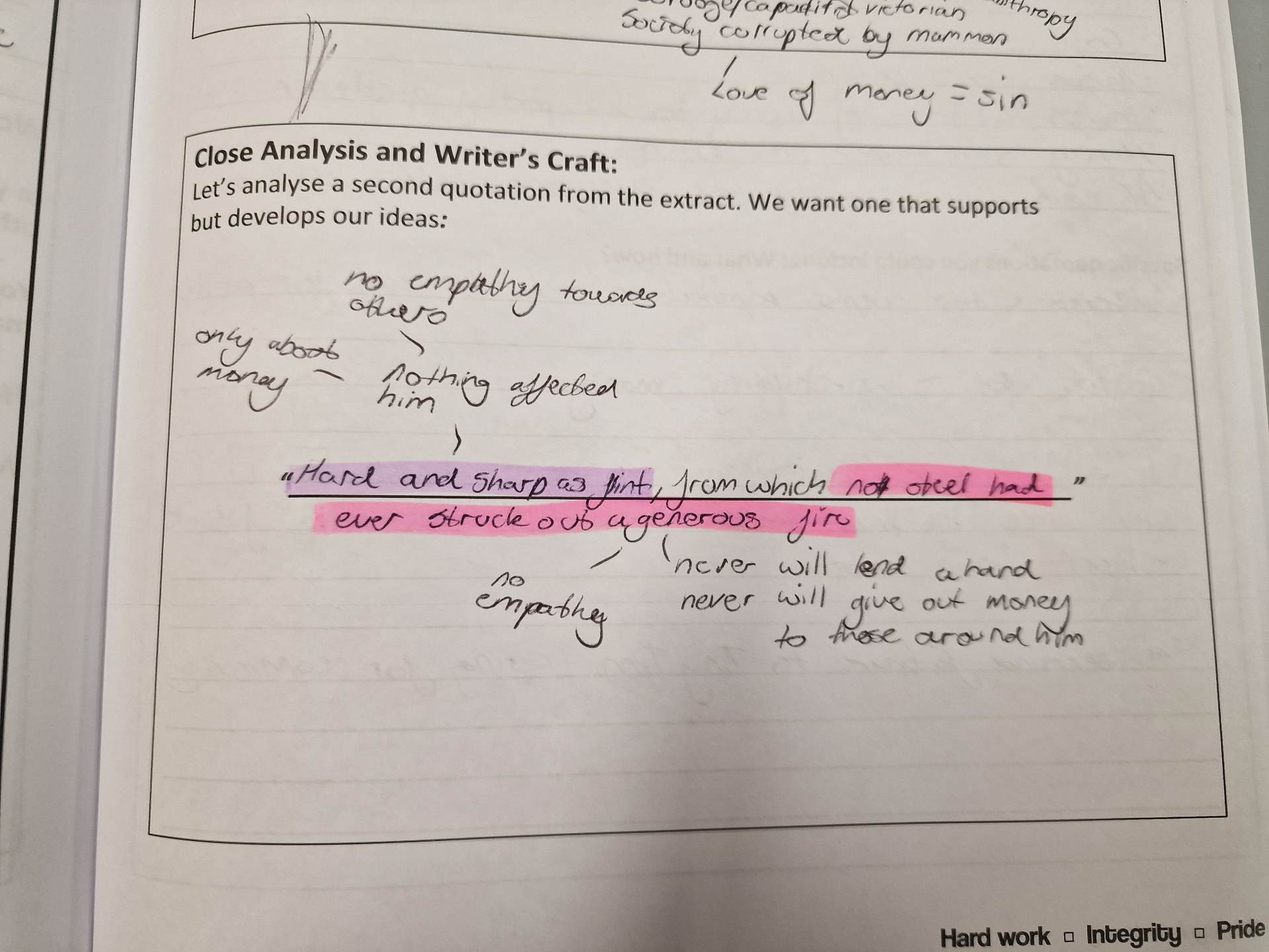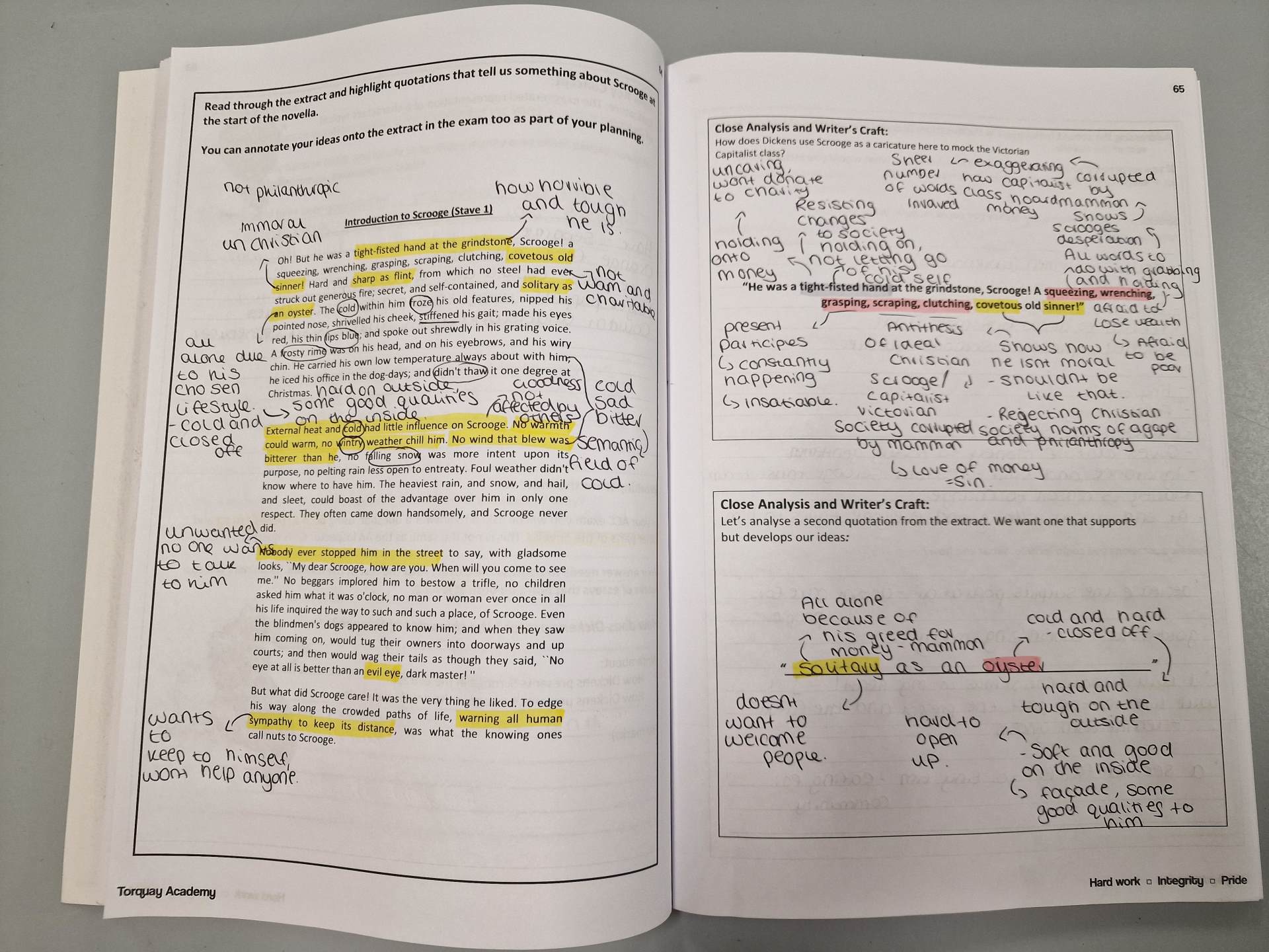 In their most recent full lesson, the students have moved on to applying their newfound knowledge to an extract from the text with the goal of preparing to answer the question: How does Dickens present the character of Scrooge? After reading through the extract, students had to independently pick out and highlight the evidence they thought would be the most useful, using their understanding of the novella's key messages to help them unpick the text - just as they would have to in their final exam. We then broke down one particular quotation in detail as a class, focusing on small sections and thinking about how we could use Scrooge as a symbol of the Victorian elite as a whole.