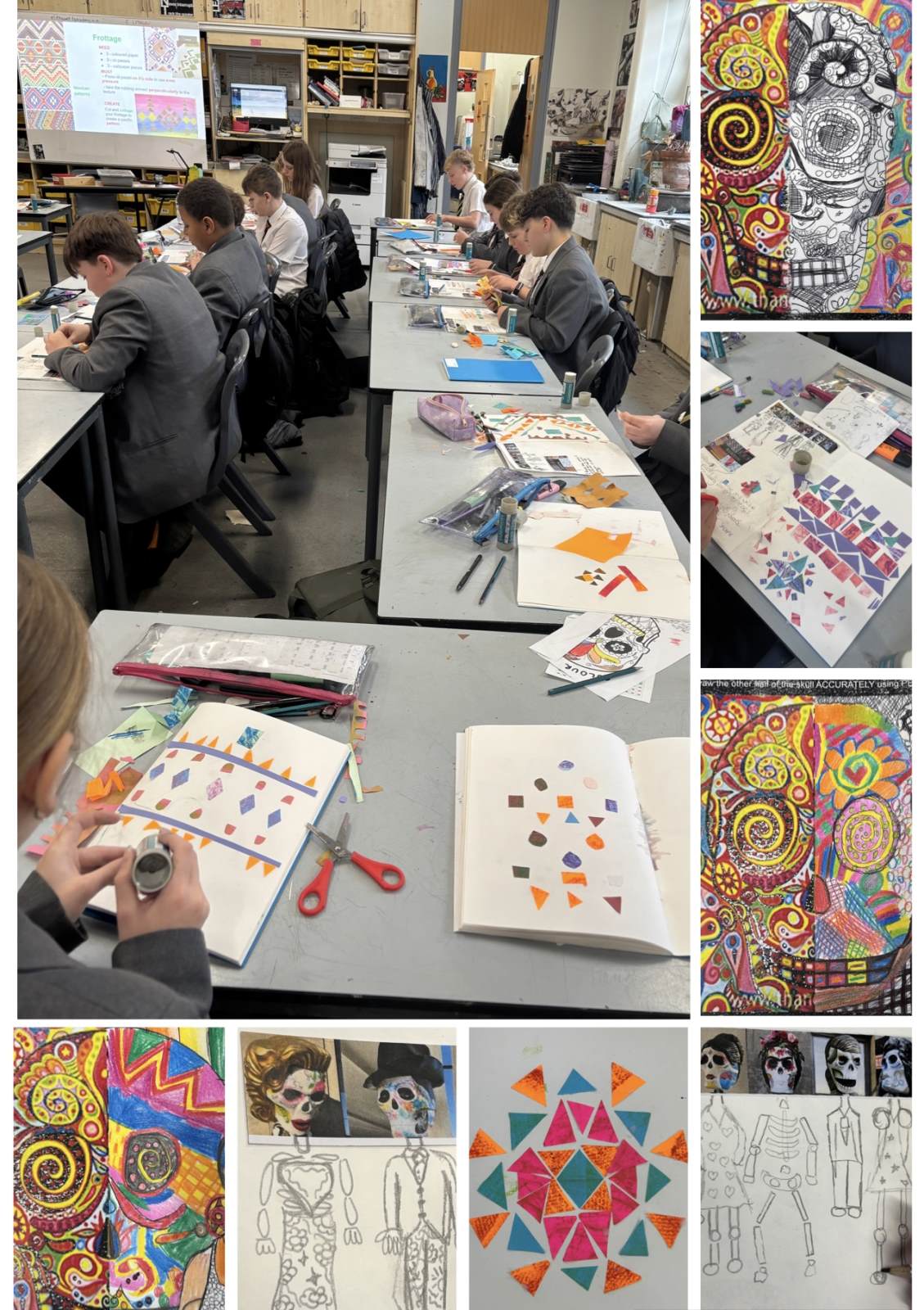 This week Mrs Lithgow's Year 7 classes have completed their vibrant Day of the Dead project, exploring Mexican art and pattern. Students used frottage and collage techniques to create bold Mexican-inspired patterns, before letting their imaginations run wild designing playful skeleton characters. The project concluded with a skull assessment drawing, where pupils demonstrated growing confidence with colour pencil and pen, focusing on detail, pattern and tone. They worked incredibly hard on these tasks and have produced beautiful sketchbook pages.