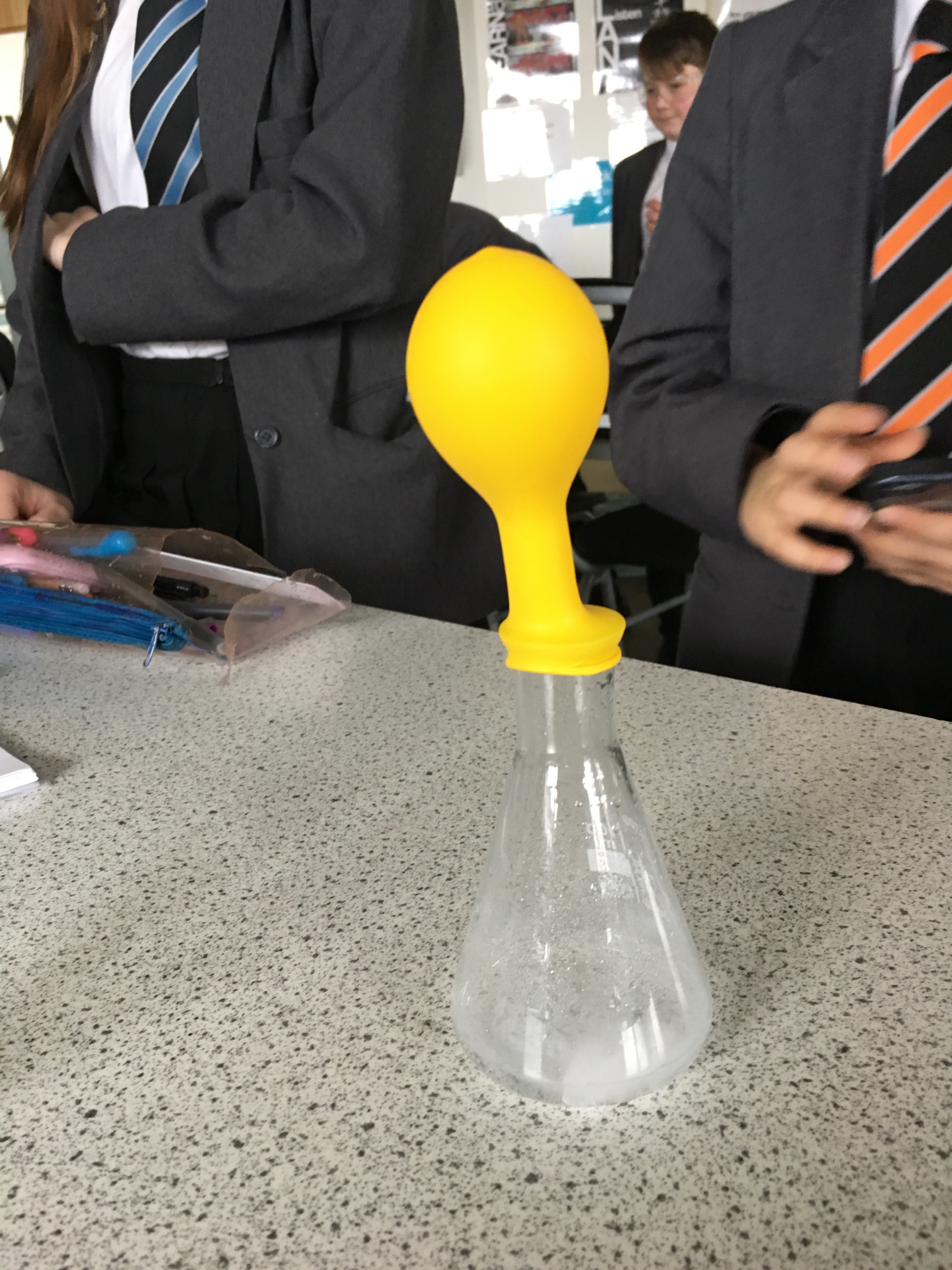 Here we see a group of Year 7 students investigating the principle of the Conservation of Mass by reacting magnesium with acid and collecting the resulting hydrogen gas in balloons.