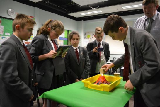 The model was extremely lifelike and using a bit of chemistry, Corey made it erupt in lessons to demonstrate what it would be like if you lived near one. The ‘lava’ spilled out over the side of the volcano and flowed down the side just like the real thing. Corey can be seen here demonstrating an erupting volcano to some year 7 students who had taken an interest in his excellent working model.