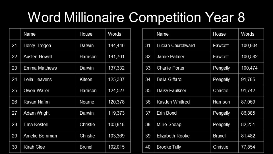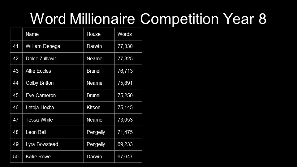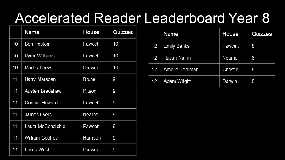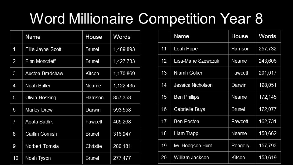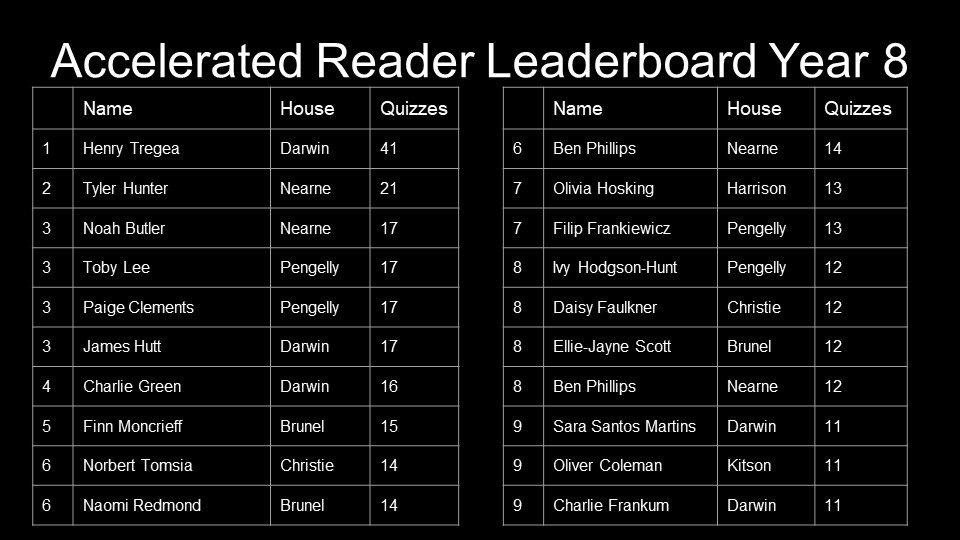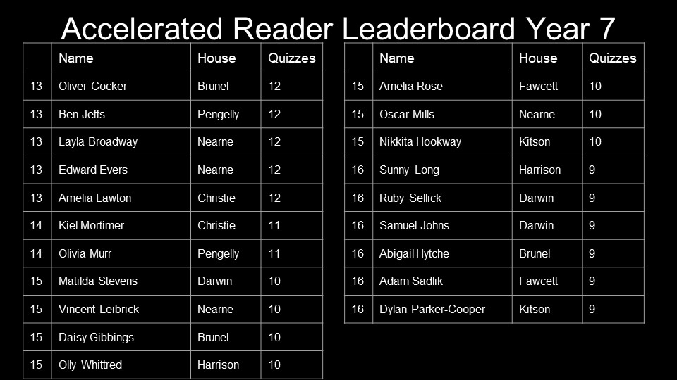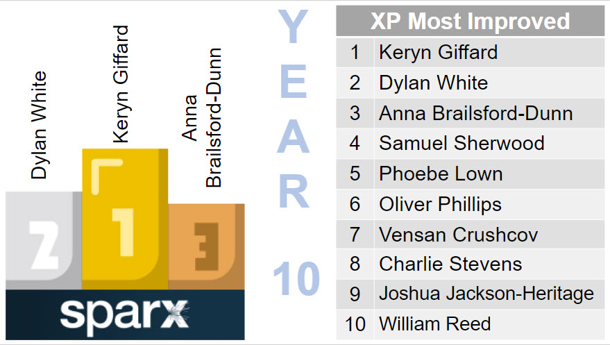 Year 10 – Andre Derdiyok, Alana Mitchell, Jazz Povey, Calum Oldham, Evan Kinghorn, Courtney Dowen,James Scrimgeour, Honey Darke, Oriana McCaul, Jack Alcock, Livvy Tysall, Samuel Charman, Owen Greenwood, Aleasha Dunford, Zak Berryman, Redd Benson, Nadia Wisnik, Freya Hyde, Evie Sutton, Jack Darke, Coral Rogers, Darby Thompson-Wade, Sophie Caton, Charlie Pope, Karolina Lagodzinska, Sophie Denison, Gabriel Prior, Summer Mansell, Lewis Dewar, Hayden Gibson-Roche, Jamie Dyer, Joseph Oborn, Ben German and Katie Williams
