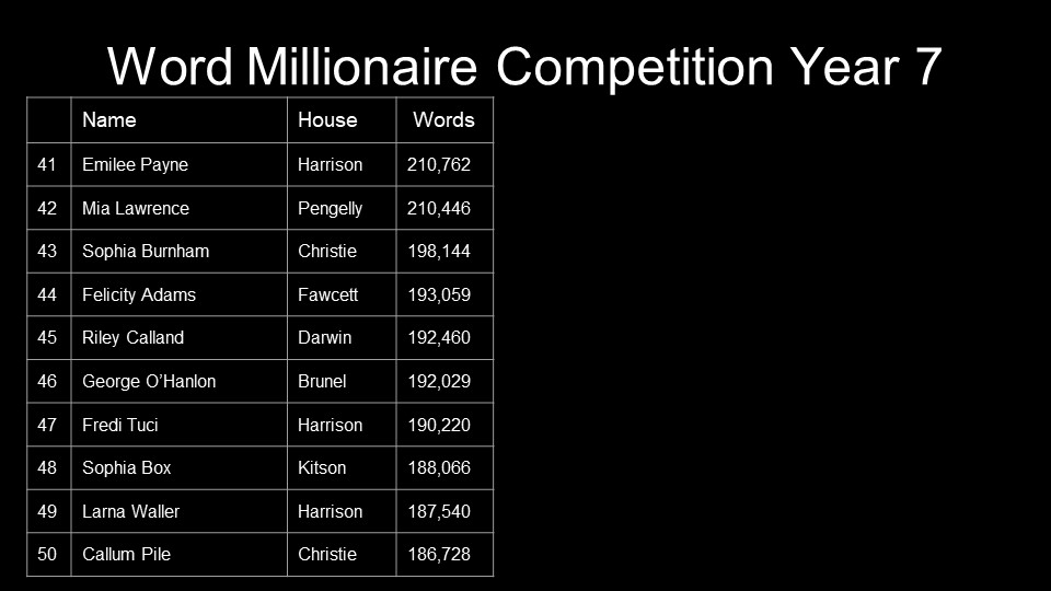 Year 9 – Lacey Nicholson, Bradley Crook, Amari Hadley,Amber Mercer, Thomas Stimpson, Lily Lewis-Shermer, Maisy Green, Jarad Silk, Oly Jackson, Sophie Packer, Josh Spencer, Curtis Poynton, Elspeth Herring,Bobby McAllister, Igor Piewiszko, Sam Hext, James Ferris, Marcus De Lucis, Coral Stewart, Tia-May Anderson,Oliver Reeves, Lilly John, Sajor Camara, Ryan Hooper, Presley Driscoll-Wilding, Chloe Brown, Lewis Ralph, Ben Baker, Emily Miller, Alfie Wildy, Jude Medworth, Isabella Aguado-Georgian, Oliver Huxtable, Jayjay Henderson, Riley Skinner, Libby Davies, Riley Batten, Cleo Fry, Jake green, Bethany Evans Rogers, Nisha Cosslett, Maja Davies, Enrika Vasiliauskaite, Samuel Eaton, Tammy Westacott, Daisy Bond, Aleah Coombes, Oliver Keating, Nikola Drygiel, Karl Burton, Skye Williams, Maddy Fairhurst, Kevin Viera, Phoebe Hewings, Mia Weston, Poppy Wallace – Fisher, Jake Pettit, Isla Howarth, Alex McDowell, Cameron Sturtridge, Abigail O’leary-Black, Tayler Reynolds, Riley Collett and Emma Roadnight